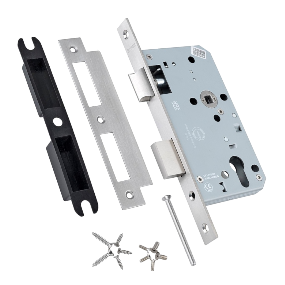 The Briton 5760 is a DIN standard euro profile escape sashlock. It has a 60mm backset with 72mm centres and a profiled latch which is reversible. One turn of a cylinder will throw the bolt 20mm. The 5760 sashlock has been fire tested to EN 1634-1 for use on fire doors up to 1hr timber / 4hr steel when used with the appropriate intumescent kit (Briton 5000.IP).