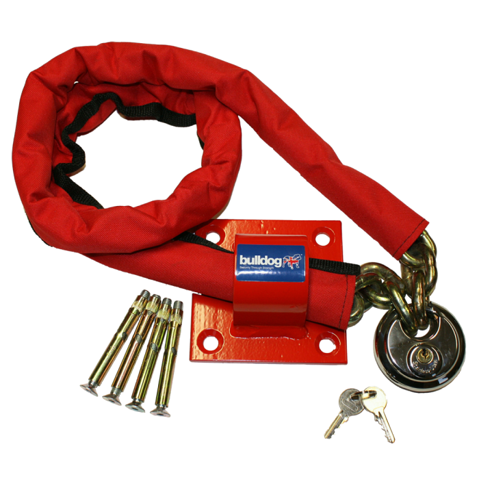 The MC30 from Bulldog is a comprehensive kit for ground anchoring which includes a 1500mm case hardened chain and 70mm discus padlock. The ground anchor has a hard wearing red powder coated finish with a 6mm thick stainless steel construction; it is heavy duty and highly visible. It is suitable for either floor or wall mounting and supplied with 4 x 80mm M10 security screws. This UK manufactured product forms the ideal set for securing small vehicles and larger work items such as motorbikes, quad bikes and ride on lawnmowers.