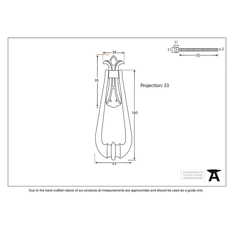A beautiful hand forged door knocker with a stunning shape and style. Fixed to your door using a bolt-through fixing, suitable for use on internal and external timber doors. Supplied singularly complete with fixings.