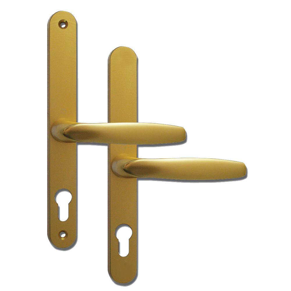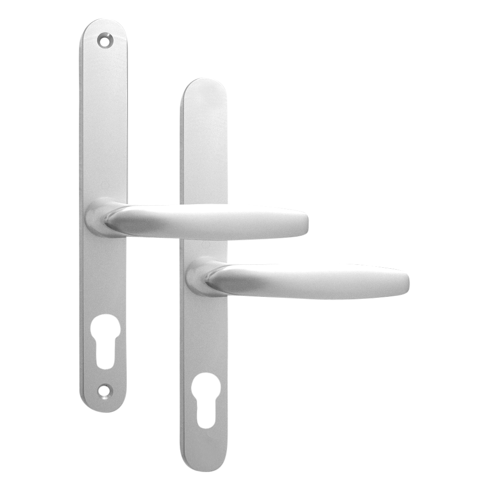 This set of lever/lever UPVC furniture has 68mm centre and 215mm screw centres and it requires bolt-through fixings.