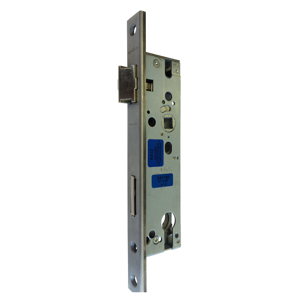 Lever operated latch & deadbolt lock case by Schüco with latch retention and single throw. This lock case has a 35mm backset, 92mm centres, 10mm spindle and a polished nickel U-Rail faceplate.